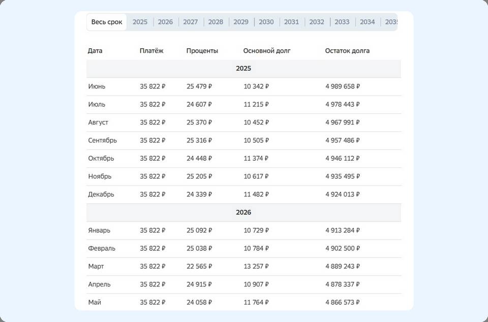 - Планируйте крупные платежи в начале кредита